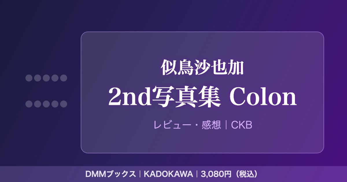 似鳥沙也加『2nd写真集 Colon』は、『Ribbon』を超える成熟美を見せる天下必身の一冊。評価★4.7(53件)と多くのファンが満足しており、写真集コレクターにも初めての方にも自信を持っておすすめできる。